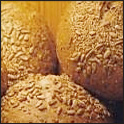 | A 50/50 white and wheat flour bread, available in oval or sandwich-shaped loaves. Covered with roasted sesame seeds, with even more seeds throughout the dough. A great sandwich bread; also delicious toasted with butter and dipped in soup. |